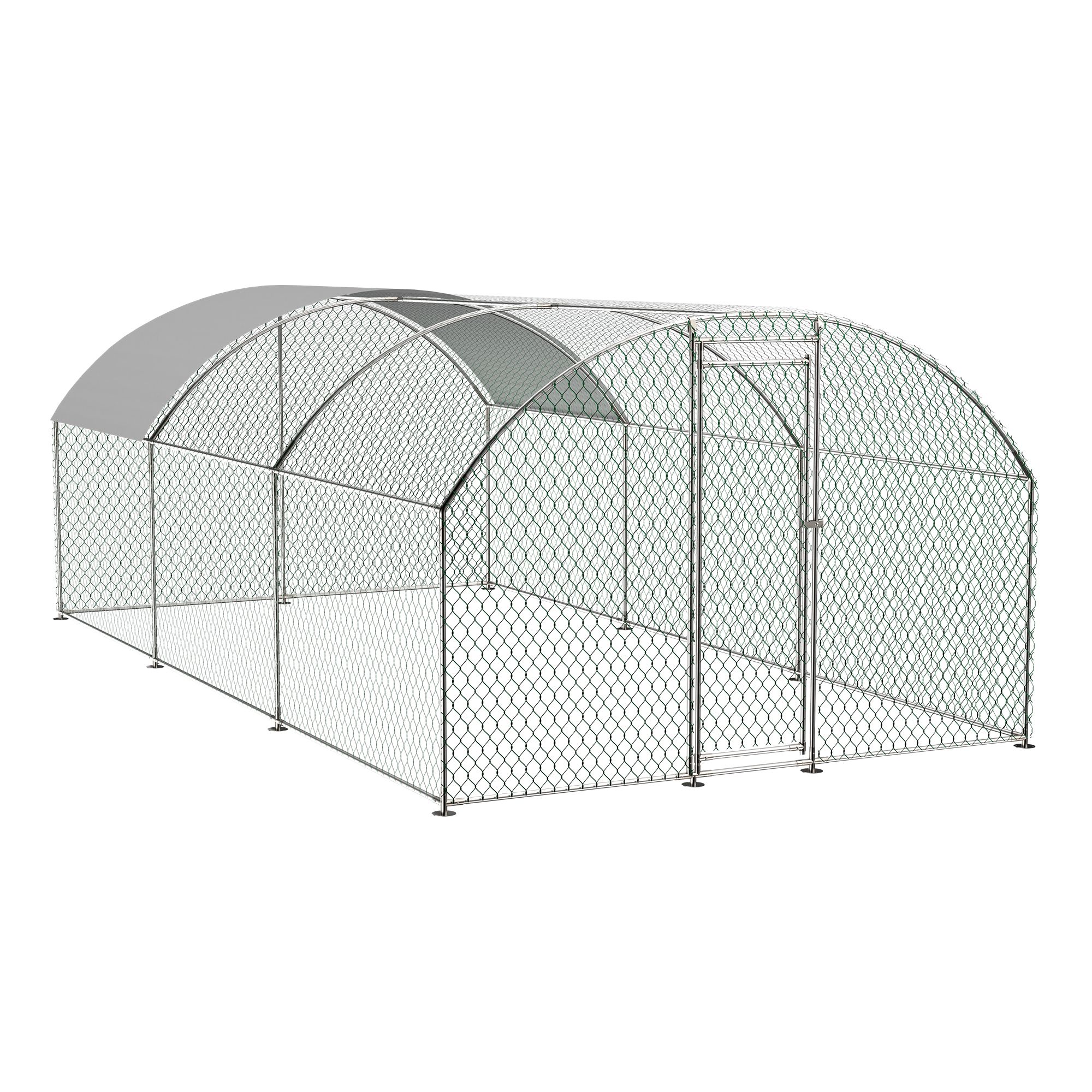 Our chicken run manufactured with high quality steel frame, including ground nails, so that the fence can better fixed to the ground.solid enough to keep the poultry from escaping and secure from predators. And this hen run house is also stably stationed to withstand the wind and snow weather.Featuring a durable sun and rain-proof tarp on the top, it is protective for the steel frame, wire mesh and animals under its cover. And the tarp is sturdy enough to avoid tear up or fade over time.With hexagonal wire mesh and the small gaps between meshes, you can prevent your chicken from some predators to make them safety.The spring clasp design requires no-welding for your quick assembly with this large metal chicken run. You can easily understand the installation with a complete set of components and simple instructions we offered.Lockable chicken run house suitable for a variety of animals like for chickens, rabbits, ducks and more.This walk-in metal poultry house has a spacious area for the animal to play and rest in the backyard garden and farm settings.